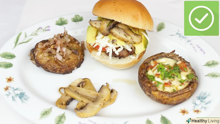 - Приготуйте бургер з грибами.смажені, тушковані або запечені капелюшки грибів портобелло ідеально підходять в якості начинки для бургера. Візьміть обсмажену булочку, додайте до грибів шматочки помідорів, тертий сир, авокадо і свої улюблені приправи.