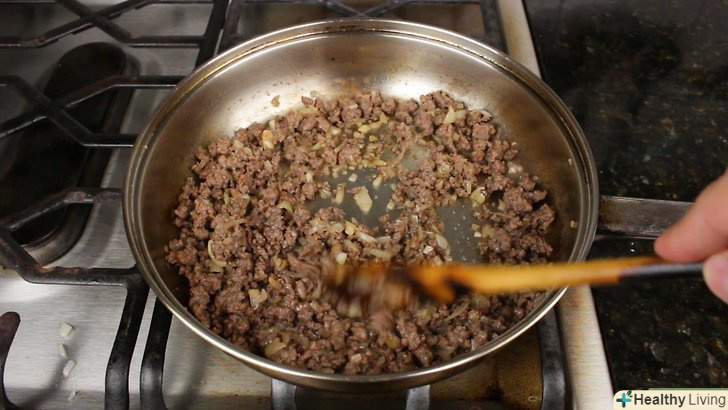 Якщо в сковороді утворилося багато жиру, злийте його.зазвичай фарш виділяє при смаженні велику кількість жиру. Якщо дно сковороди покрилося жиром, необхідно злити його. Поставте в раковину металеву банку і прикрийте сковороду кришкою. Обережно нахиліть сковороду так, щоб жир зібрався на одній стороні — при цьому притримуйте кришкою м'ясо, щоб воно не випало. Акуратно злийте жир в банку.- Зачекайте, поки жир охолоне, перш ніж викинути його.