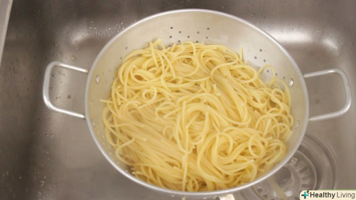 Процідіть спагетті через друшляк.коли спагетті будуть готові, вимкніть вогонь і покладіть в раковину друшляк. Обережно піднесіть каструлю зі спагетті до раковини і вилийте її вміст в друшляк.- Тримайте каструлю подалі від себе, щоб не обпектися окропом і гарячою парою.