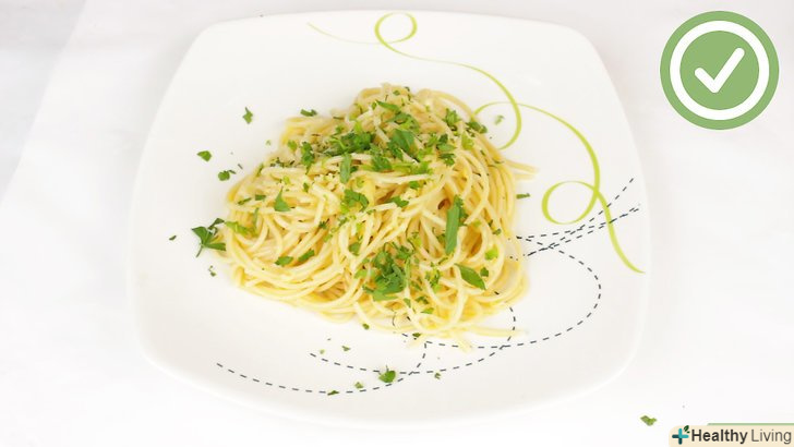 Розкладіть спагетті з соусом з пармезану і часнику по тарілках.спробуйте спагетті і при необхідності додайте сіль і перець. Посипте спагетті 2 столовими ложками (7,5 грама) подрібненого листя петрушки. Після цього відразу подайте блюдо на стіл.- Зберігайте залишилися спагетті в холодильнику в щільно закривається ємності не більше 3-4 днів.