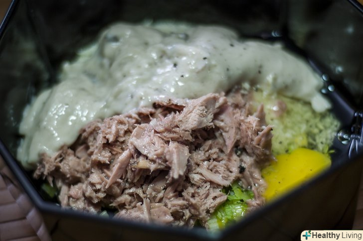 Відкрийте банку тунця і злийте рідину.перекладіть тунця у велику миску. Розімніть його виделкою.