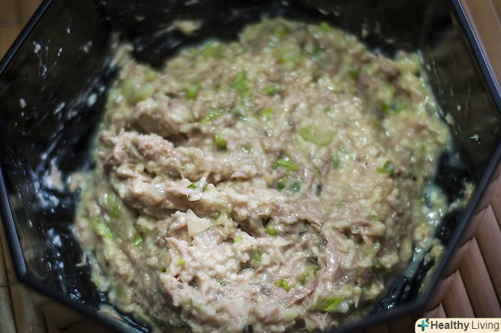 Покладіть всі інгредієнти в миску.до тунця додайте селеру, цибулю, яйце, лимонний сік і сіль. Потім вирішіть, які додаткові приправи додати:- Для котлет з тунця з травами, додайте петрушку, кріп і часниковий порошок.