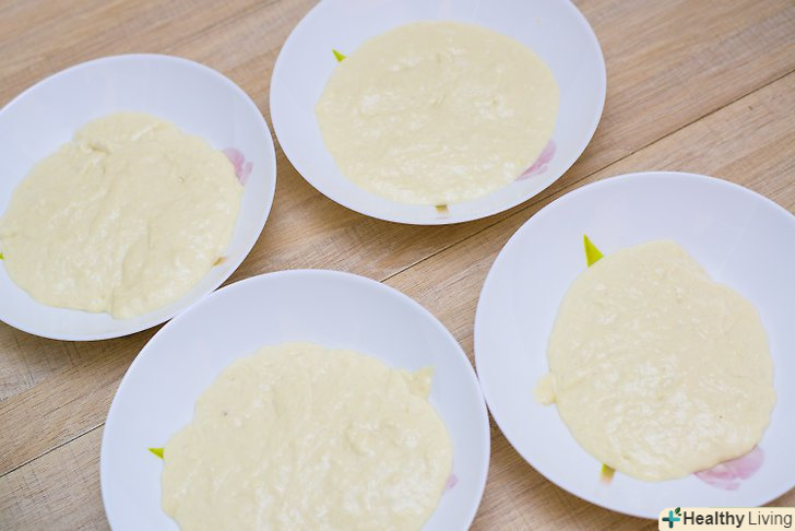 Розділіть тісто між 6 мисками.у першу миску налийте найбільше тісто, потім поступово зменшуйте кількість в кожній наступній мисці. У мисці 6 має бути найменше суміші.