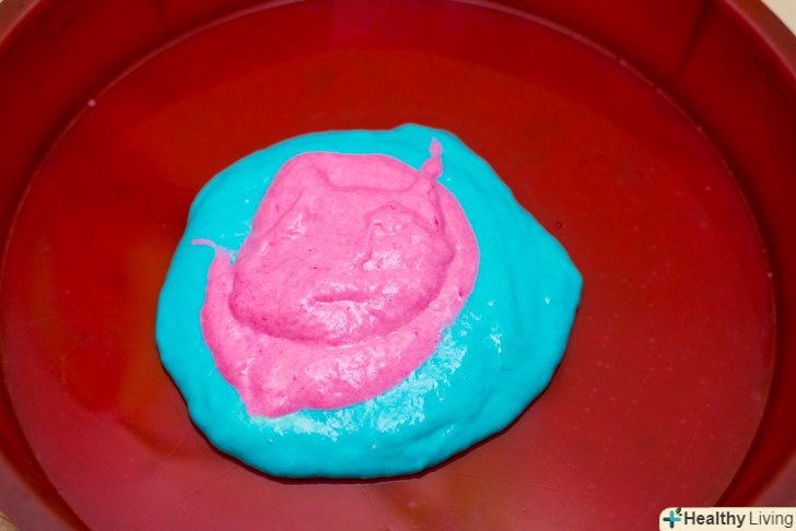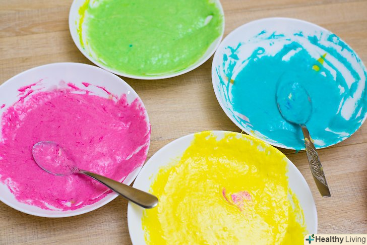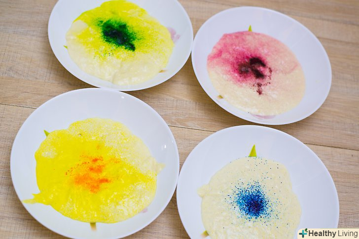 Виберіть колір на свій розсуд.видавіть барвник приблизно розміром з копійку (18 мм) в Миску 1. Продовжуйте робити це з іншими квітами з іншими мисками. Розмішайте барвники в тесті.