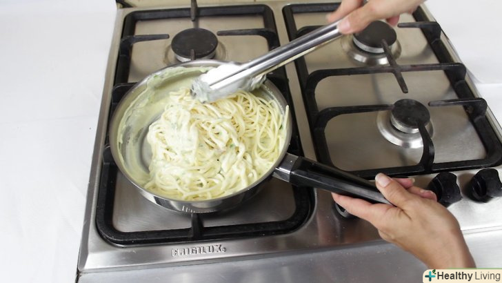 Змішайте довгі макарони з вершковим соусом Альфредо.для розподілу насиченого соусу Альфредо на довгі макарони, такі як спагетті, Феттучіні та товста локшина, використовуйте кухонні щипці. Щоб отримати класичний соус Альфредо, розігрійте жирні вершки з вершковим маслом і часником. Постарайтеся подати такі макарони зі смаженою на грилі куркою або копченим лососем.[13]- Щоб соус вийшов трохи легшим, розтопіть вершкове масло з часником і петрушкою. Потім додайте макарони в цей простий соус.